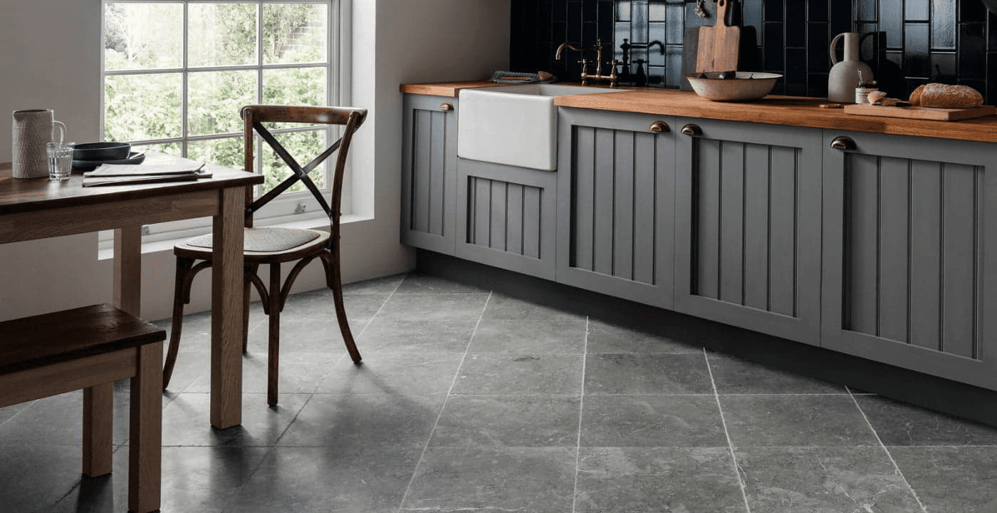 Natural stone tiles are incredibly strong and make for an unparalleled kitchen floor if properly sealed – perfect when combined with underfloor heating. Stone floor tiles are extremely durable, positioning them as one of the best flooring options for high-traffic kitchens. They are, however, typically more expensive than the other two options discussed.