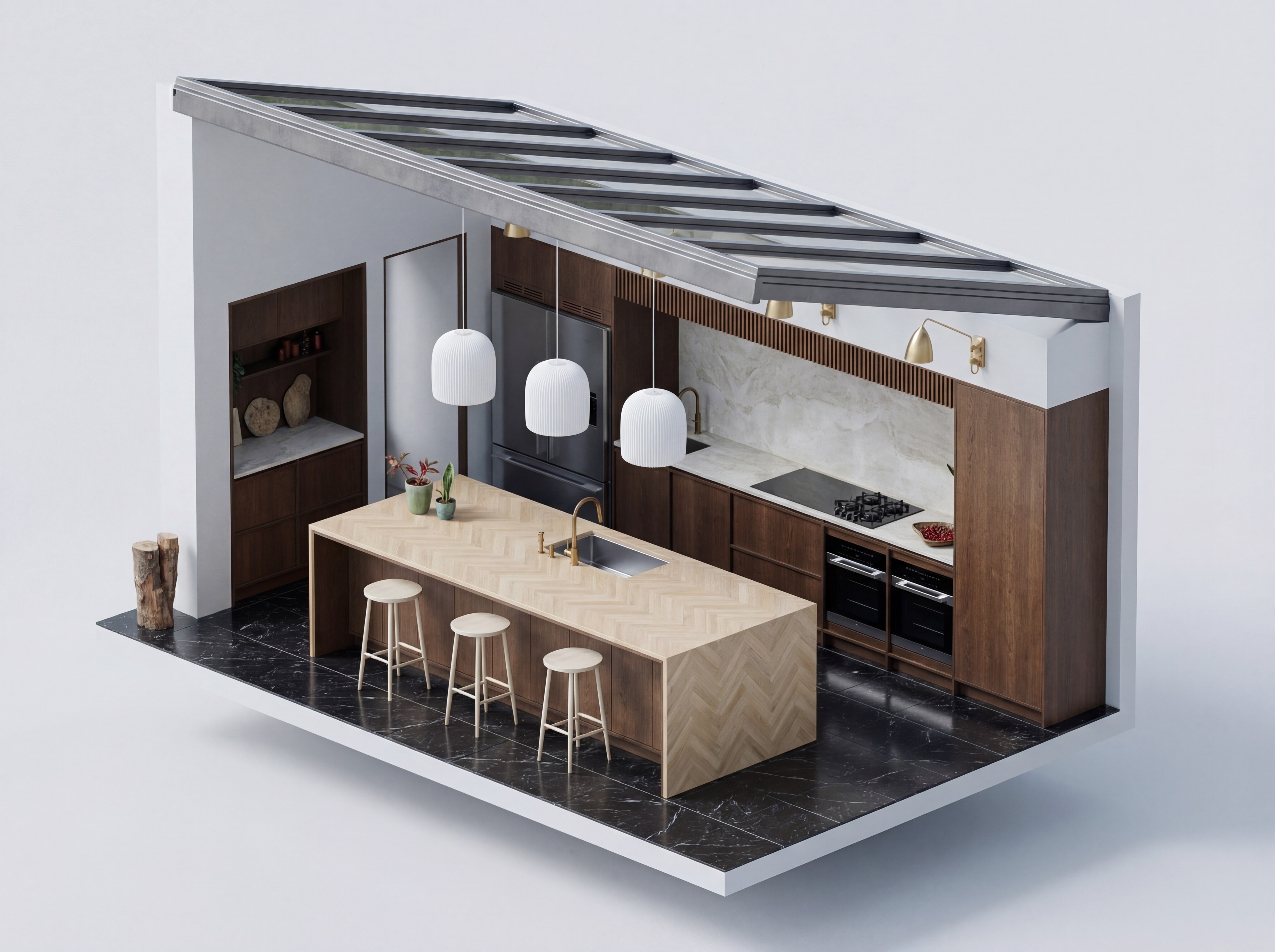 Bold materials, statement islands, design-led kitchens with texture.