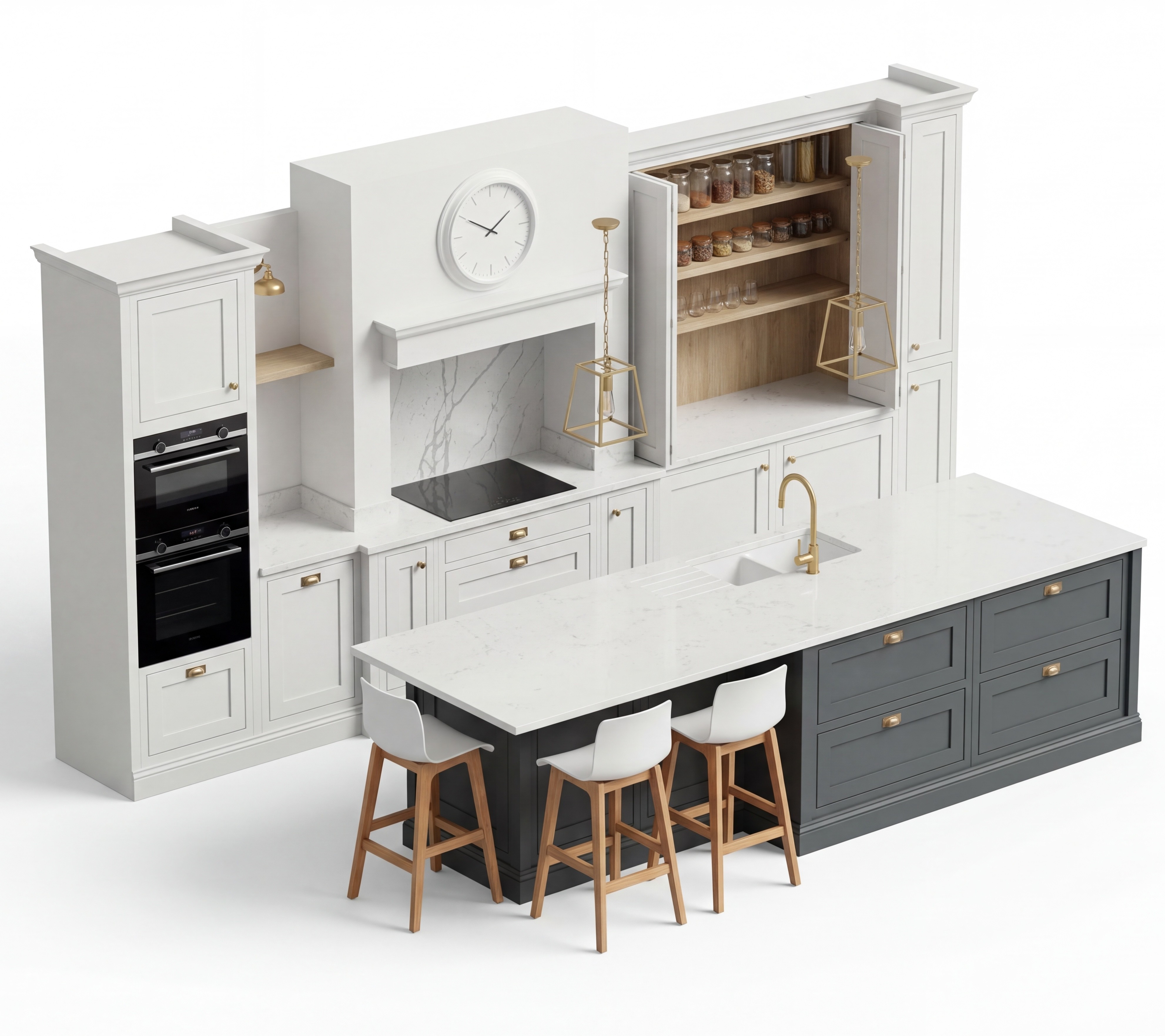 Our kitchen design in London includes an in-home survey, tailored layout plans, material selection, 3D renders where needed, and full installation coordination. Unlike design-only services, we design kitchens we'll install ourselves, so layouts work with plumbing, electrics, and your space.