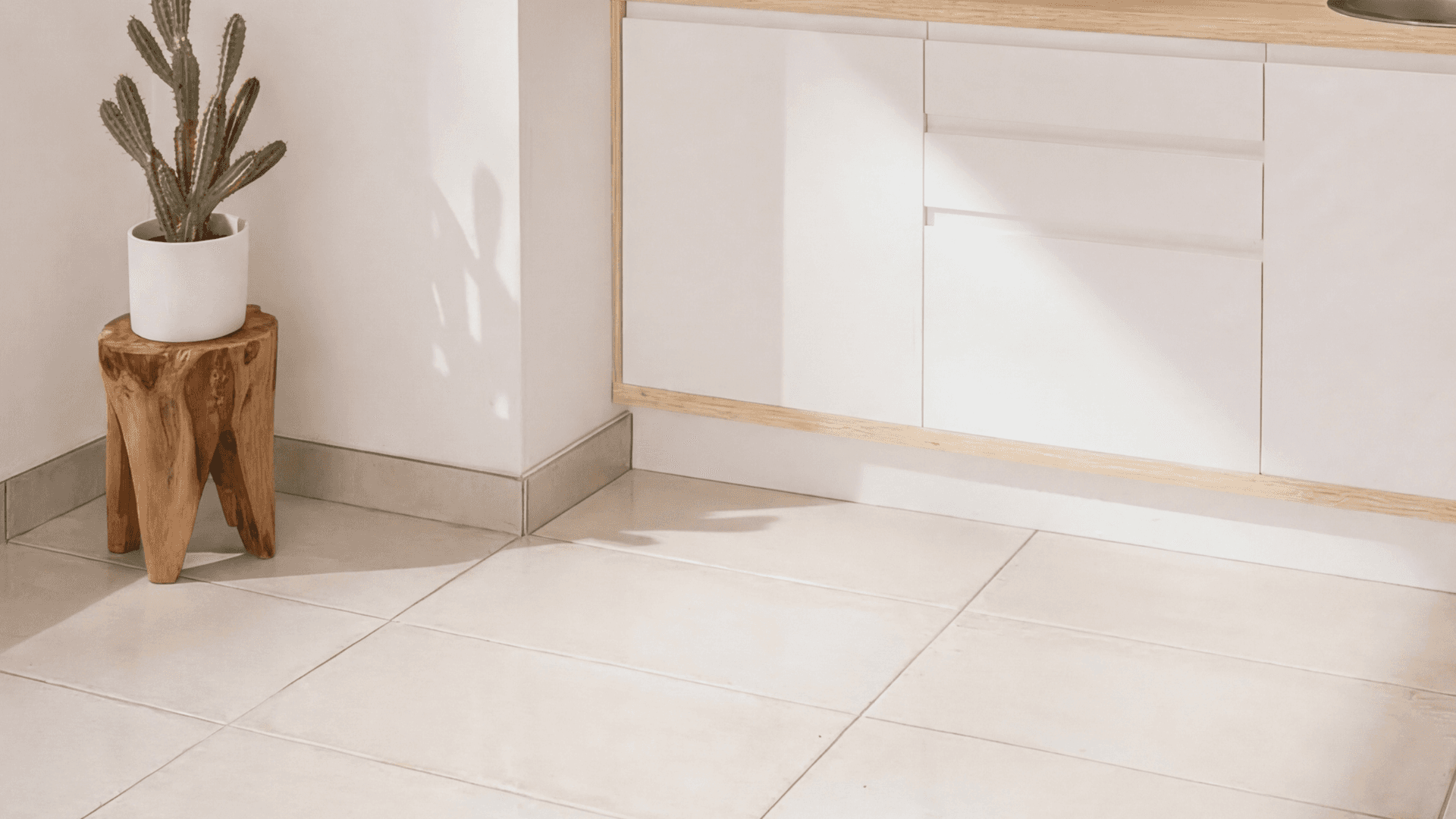 Large-format porcelain in soft concrete, stone or neutral tones achieves a similar result with more flexibility.