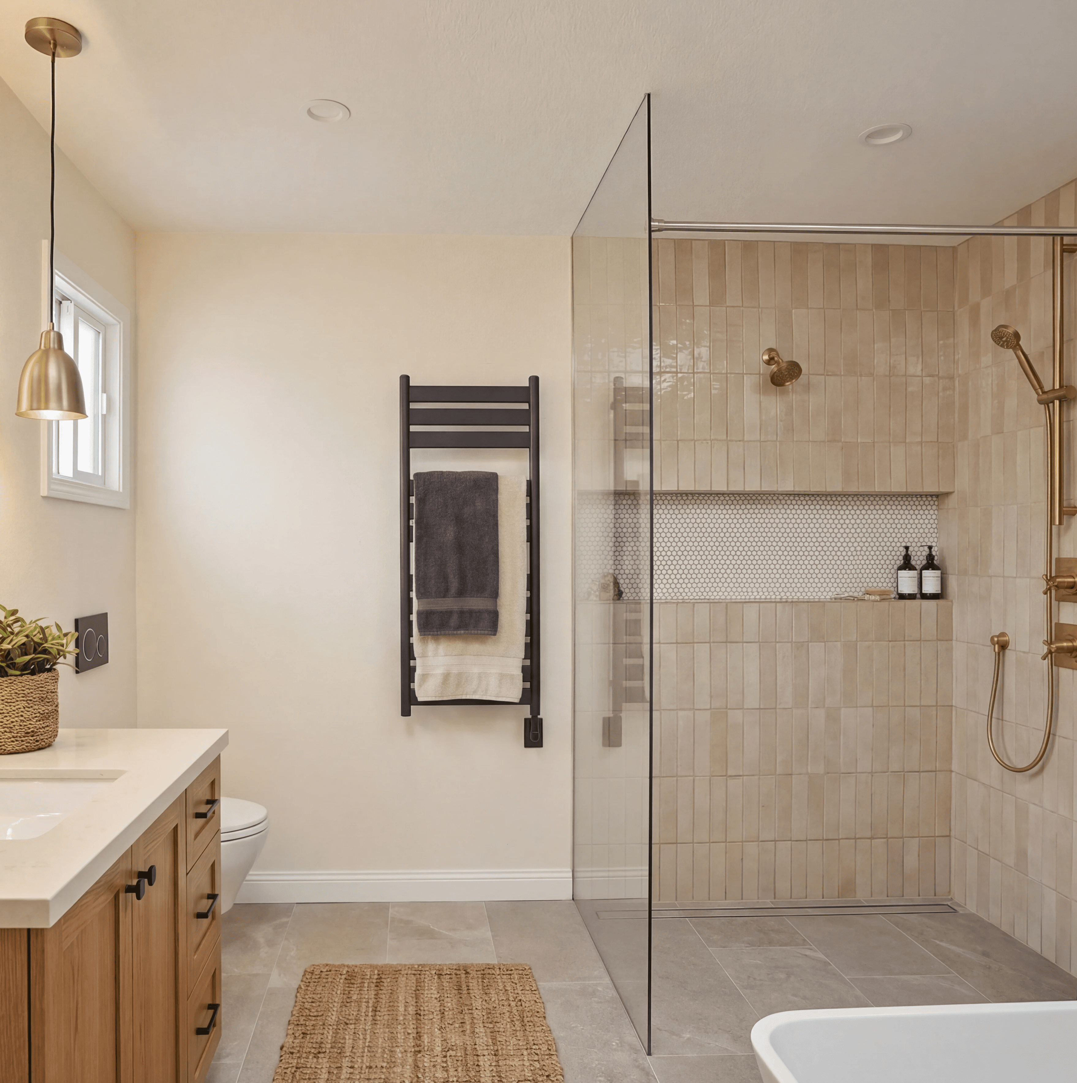 Wet rooms are fully open, level-access shower areas with floor drainage and complete waterproofing. Walk-in showers may have low thresholds, partial enclosures, or glass screens. Both require proper waterproofing and drainage, but wet rooms have no barriers and are fully tiled floor-to-ceiling in shower zones.